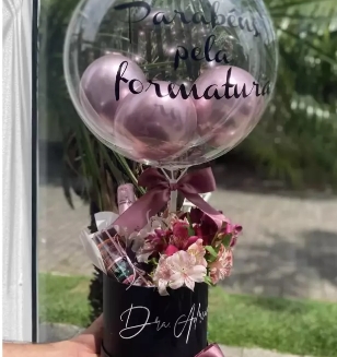Caixa box personalizada, Flores astromélias, Caixinha de macarons com 5, Espumante baby Freixenet ou Chandon, Balão Bubble personalizado *Cores e personalização a escolha